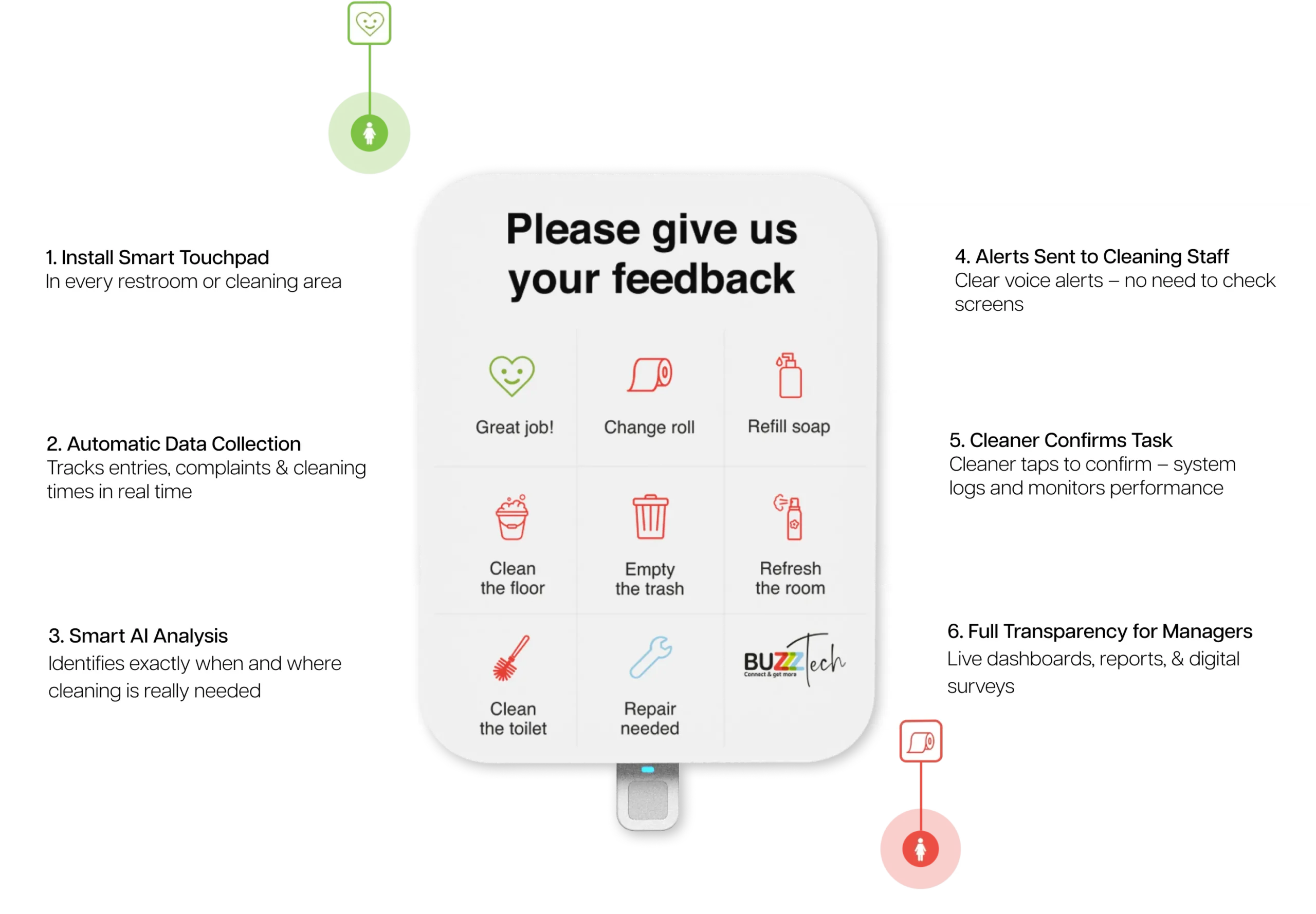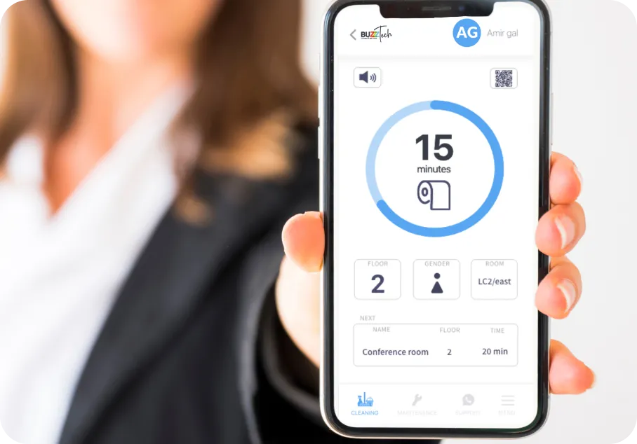 BuzzzTech is a smart platform that manages cleaning and maintenance tasks in commercial buildings. It detects issues automatically and directs cleaning staff to the right place at the right time — even before complaints arise.